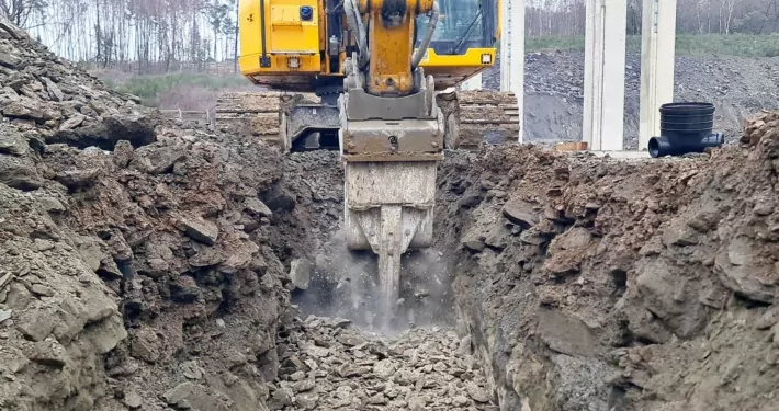 Vor dem Errichten einer großen Industriehalle werden mit einer KEMROC-Fräse EKT 100 am 25-t-Bagger die Vertiefungen für Streifen- und Punktfundamente herausgefräst.